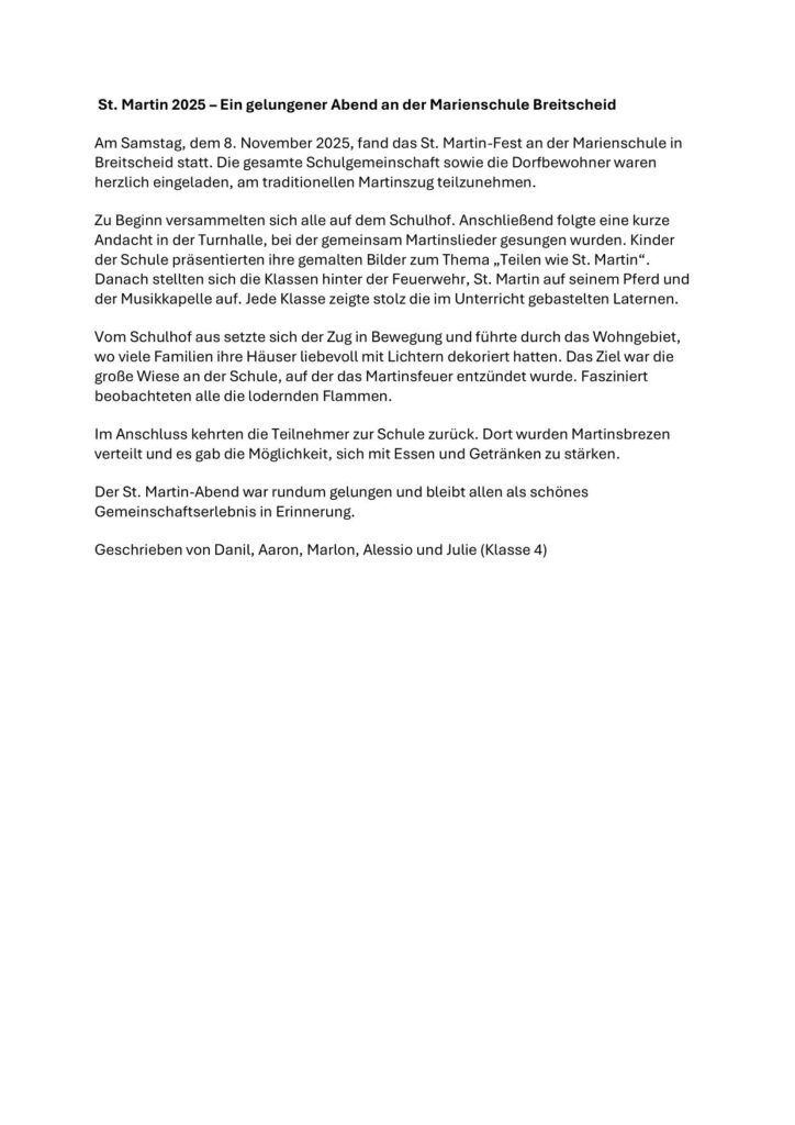 Am 11.11.2023 um 17.00 Uhr startete die Marienschule Breitscheid ihren St. Martinsabend mit einer Andacht, bei der die Kinder Martinslieder singen konnten und das traditionelle St. Martinsstück aufgeführt wurde.