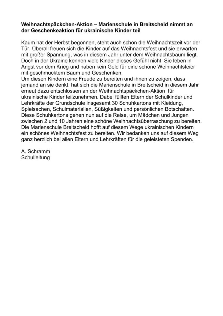 Seit vielen Jahren engagiert sich die Marienschule Breitscheid für die Aktionsgruppe „Kinder in Not“ e.V. in Windhagen. Auch dieses Jahr haben Schule, Eltern und Schüler gern an der Aktion „Weihnachtswunschbaum“ teilgenommen.