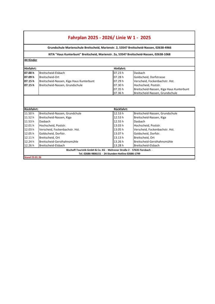 Die Nachmittagsbuszeiten variieren schon mal, da die entsprechenden Busse vorher die Schulcentren Waldbreitbach und Neustadt anfahren müssen. Bitte haben Sie Verständnis dafür, dass eine Zeitspanne von +/- 15 Minuten in der Ankunftzeit an manchen Tagen entstehen kann.